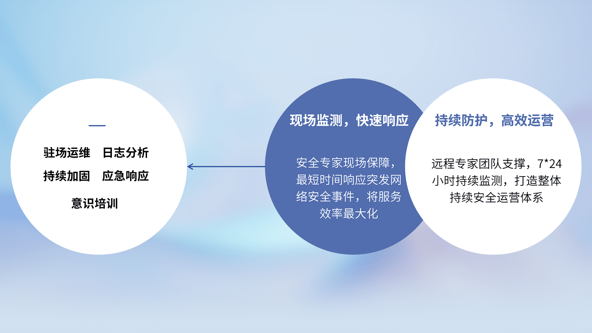针对客户行业特性,,提供专属的一站式安全管理服务,,,帮助客户全面感知网络空间威胁,,,,通过安全专家的线上、、线下防护支持,,,,实现风险闭环,,,,将安全保障常态化,,,为客户打造常态化安全运维运营服务。。
